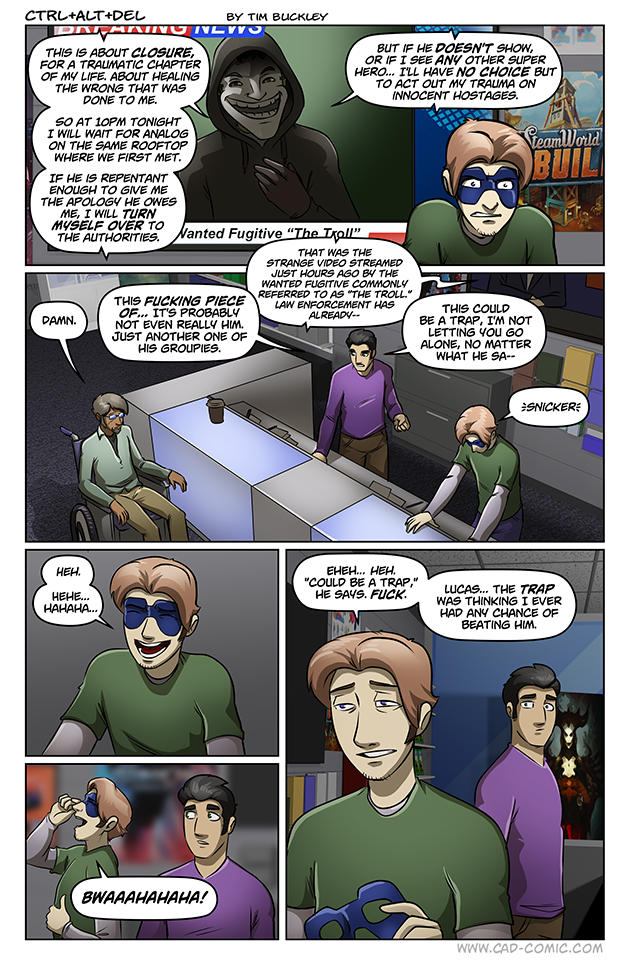 So ageless long time reader (started reading OG CAD just after the 3rd or 4th original comic got published!) Finally decided to post a comment. I’m wondering if Ethan might not use the trolls live broadcast to counter-troll him? Make it seem like the troll killed him and others etc or something? I cant remember if the troll knows of Ethan’s respawning power or not?