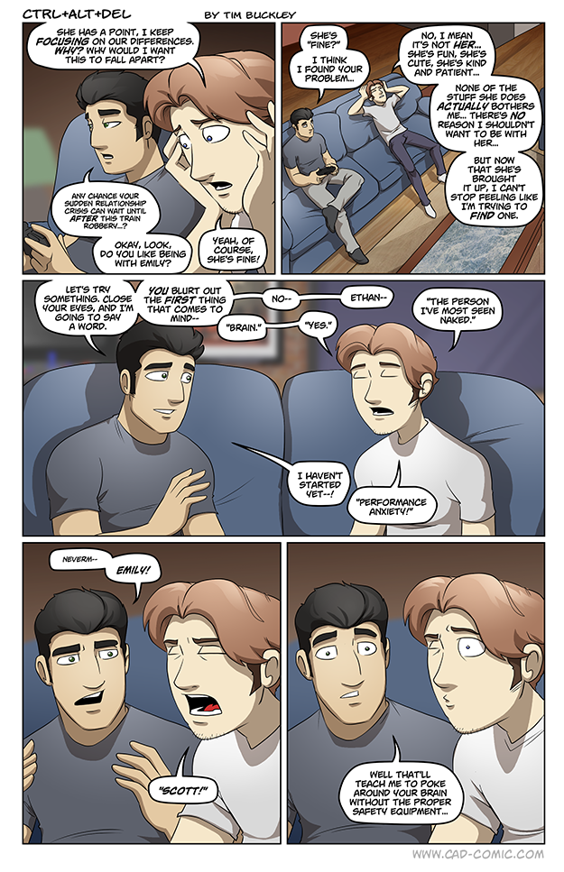 Scott is pretty upset last thanksgiving comic when asked by lucas if he is ready to start dating again. To the point where I kind of assumed that maybe his girlfriend had died. I also kind of wonder if Scott and Ethan’s sister were dating. Ethan’s sister gets killed walking home from a movie, and Scott gets injured? Somehow tying into Ethan not wanting a relationship while Scott still hurts over Ethan’s sister? Maybe not sensible, but sometimes peoples minds do weird things. Just spitballing, and maybe Emily’s face just reminds Ethan of Scott somehow and he subconsciously does not… Read more »
