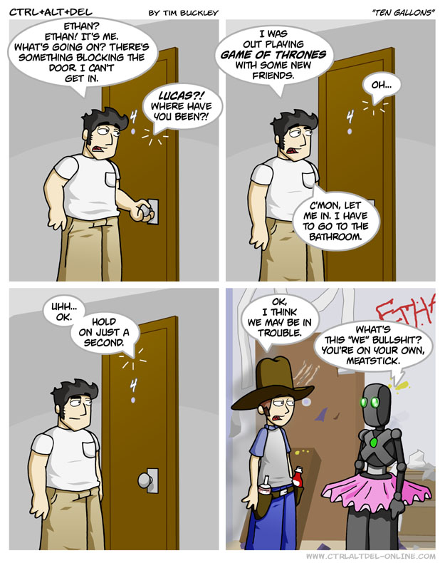 First Previous Random Next Last | 2 Share You are currently browsing the archive for Ctrl Alt Del First Previous Archive Random Next Last | 2 Share Tweet 24 Ten gallons May 6, 2005 by Tim Subscribe Notify of new follow-up comments new replies to my comments Label {} [+] Name* Email* Δ Label {} [+] Name* Email* Δ 2 Comments Oldest Newest Most Voted Inline Feedbacks View all comments Conor 7 years ago Xbot has become one of my favorite characters, haha Reso 3 years ago The 4th panel has such a chef Brian feel to it.