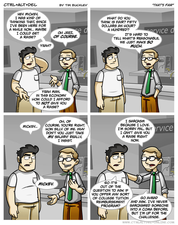 First Previous Random Next Last | 1 Share You are currently browsing the archive for Ctrl Alt Del First Previous Archive Random Next Last | 1 Share Tweet 24 That’s fair April 13, 2009 by Tim Subscribe Notify of new follow-up comments new replies to my comments Label {} [+] Name* Email* Δ Label {} [+] Name* Email* Δ 1 Comment Oldest Newest Most Voted Inline Feedbacks View all comments Him. 8 years ago HS puns… 0. Congratulations. The beginning of one of the top 10 biggest webcomics’s birth day and you made no unintentional puns. Good or bad is your choice 🙂