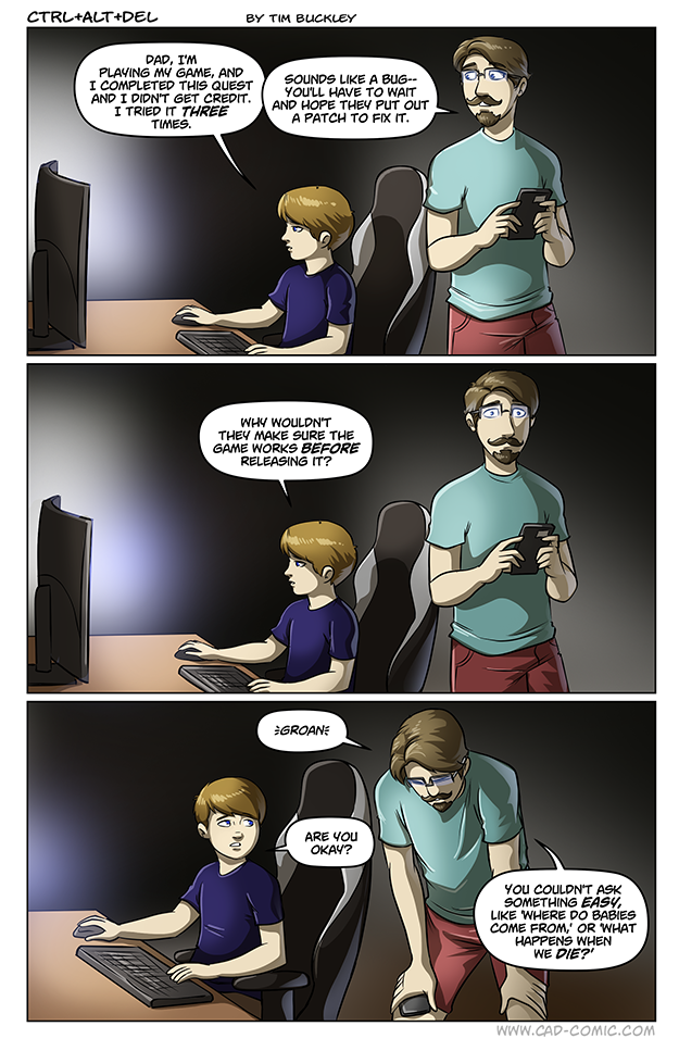 It’s not remotely that simple, and if you read the small blog at the end of the comic you’d have an idea. The original NES Mario game ha 16,000 lines of code. And it’s not entirely bug free. In comparison, Grand Theft Auto V has 60,000,000 lines of code. In comparison, human DNA only has between 75 million and 3.2 billion lines of code, depending on how you interpret a “line.” Video games are a console generation or two away from being as complex as a human being! (Which are notoriously prone to bugs.) A bug could be caused by… Read more »