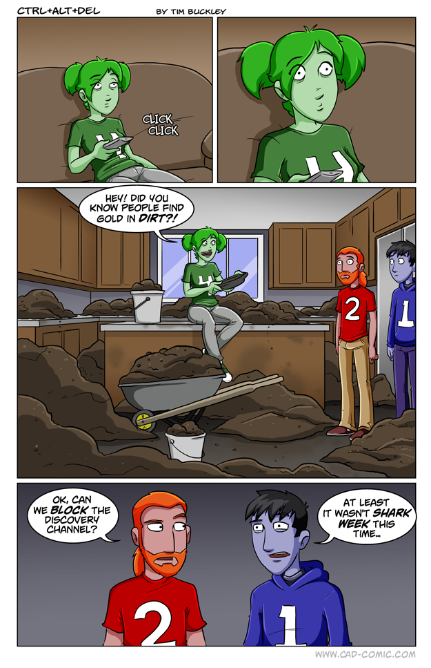 First Previous Random Next Last | 4 Share You are currently browsing the archive for Ctrl Alt Del First Previous Archive Random Next Last | 4 Share Tweet 24 The more you know February 1, 2013 by Tim Subscribe Notify of new follow-up comments new replies to my comments Label {} [+] Name* Email* Δ Label {} [+] Name* Email* Δ 4 Comments Oldest Newest Most Voted Inline Feedbacks View all comments Him. 7 years ago Shark was…well, the LARP group had a nice time. BrokenBanette 7 years ago HOLY CRAP!!! Four is the new Ethan… Wumbo 5 years ago Reply to BrokenBanette Next thing we know 4:Hey, did ya know there is gold in people? Chainsaw:Vrmm, Vrmmm, VRMMM Dingleshits McDanglybits 4 years ago Shark week. Excellent period pun.