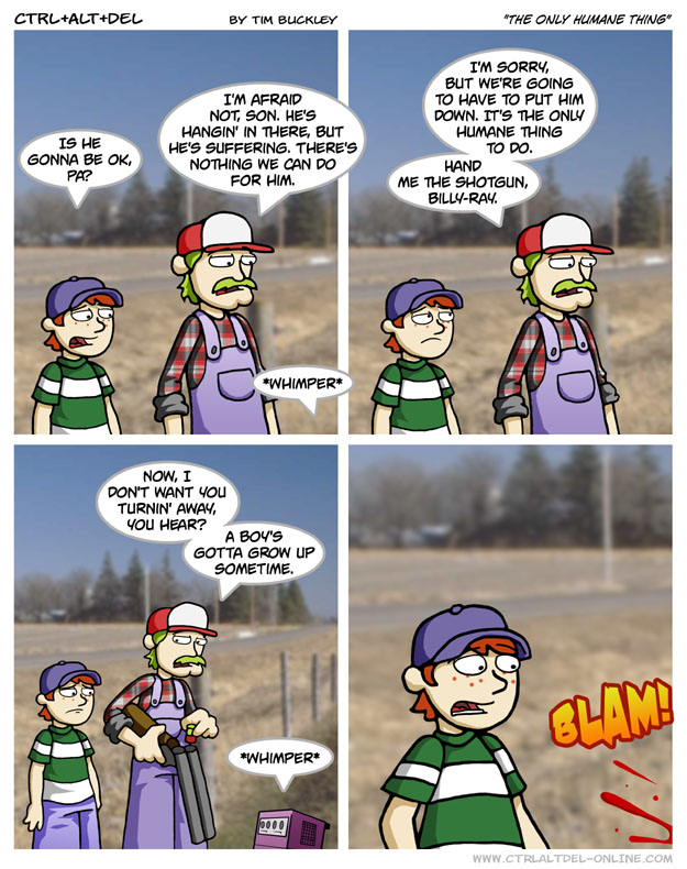 First Previous Random Next Last | 3 Share You are currently browsing the archive for Ctrl Alt Del First Previous Archive Random Next Last | 3 Share Tweet 24 The only humane thing June 6, 2005 by Tim Subscribe Notify of new follow-up comments new replies to my comments Label {} [+] Name* Email* Δ Label {} [+] Name* Email* Δ 3 Comments Oldest Newest Most Voted Inline Feedbacks View all comments Somewhere 8 years ago This would be more brutal if it wasn’t agonizingly accurate. I mean really, the Gamecube was screwed up in comparison to its rivals. But, like a drowning phoenix, there was the Wii/DS generation. RMagepedia 7 years ago Reply to Somewhere LIKE A DROWNING PHOENIX, ONRAC IS REBORN! AGAIN! Hello 6 years ago Really wanna know how you got the background for this comic..