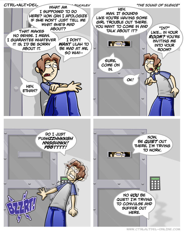 First Previous Random Next Last | 7 Share You are currently browsing the archive for Ctrl Alt Del First Previous Archive Random Next Last | 7 Share Tweet 24 The sound of silence December 16, 2006 by Tim Subscribe Notify of new follow-up comments new replies to my comments Label {} [+] Name* Email* Δ Label {} [+] Name* Email* Δ 7 Comments Oldest Newest Most Voted Inline Feedbacks View all comments SilverxSnake 8 years ago hmmm….. PENGUIN WAS IN ON IT ALL ALONG!!! Him. 8 years ago Reply to SilverxSnake Ted has no time for infantile Human shenanigans like life, so he decides to ask Scott to kindly shut the Ethan (synonymous with hell) up. Arceus 7 years ago Ethan has never even addressed the keypad on the wall, ever since Scott had that door and security system installed TIM THE TAT MAN 5 years ago Reply to Arceus well what is scott even doing in his room? Stacts 2 years ago Reply to TIM THE TAT MAN Building a portal to return to his home dimension (where Linux is the reigning OS and windows never happened because DOS never took off). Yeet2 5 years ago See, I pulled a sneaky on ya goombanatti 4 years ago scott is just being a dick