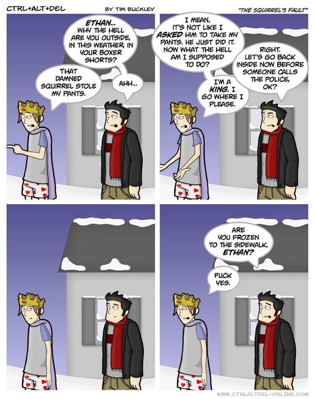 First Previous Random Next Last | 1 Share You are currently browsing the archive for Ctrl Alt Del First Previous Archive Random Next Last | 1 Share Tweet 24 The squirrel’s fault January 31, 2003 by Tim Subscribe Notify of new follow-up comments new replies to my comments Label {} [+] Name* Email* Δ Label {} [+] Name* Email* Δ 1 Comment Oldest Newest Most Voted Inline Feedbacks View all comments Hamstermer 8 years ago H…How did a SQUIRREL take his pants? HOW? Oh right, De(than)lusions of Idiocy…