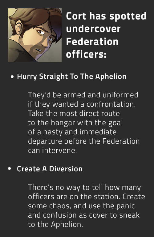 My first instinct was to go straight for the ship, but I’m assuming the federation is definitely there for Cort, since they already know he’s there, they probably have his ship watched as well. Seems like a distraction will give them the easiest chances of getting out of there.