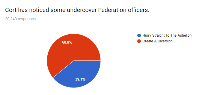 I voted for hurry just in case it was paranoia or mistaken identity, but after Cort’s presentation of the evidence that they were in fact Federation officers, I’m on board with distraction.