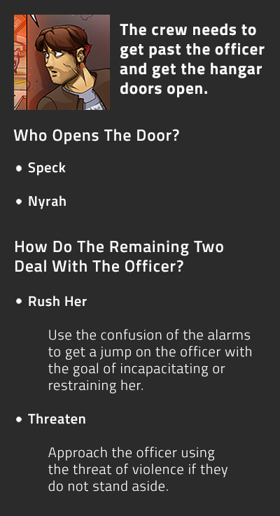 I get the feeling we have two successful combinations and two not so successful ones. Speck doesn’t seem all that fast so if he goes for the door I’d imagine the best option Cort and Nyrah have is to rush the officer. However can Speck even get up to the deck control in a reasonable timeframe? If Nyrah goes for the door then possibly threatening her with Speck spitting on her or whatever could work. It may be that since Speck might not look as suspicious/wanted as Cort or Nyrah he could work as a distraction so Cort could take… Read more »