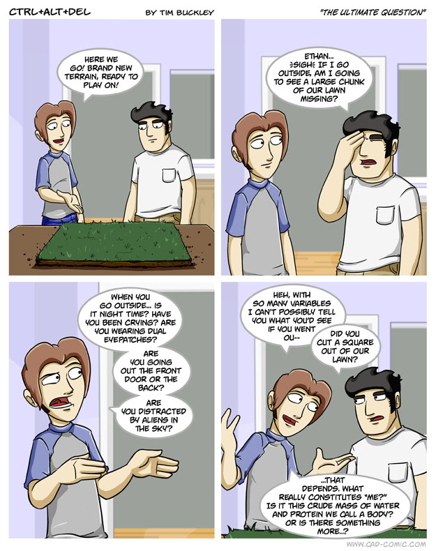 First Previous Random Next Last | 3 Share You are currently browsing the archive for Ctrl Alt Del First Previous Archive Random Next Last | 3 Share Tweet 24 The ultimate question December 8, 2010 by Tim Subscribe Notify of new follow-up comments new replies to my comments Label {} [+] Name* Email* Δ Label {} [+] Name* Email* Δ 3 Comments Oldest Newest Most Voted Inline Feedbacks View all comments MidnightDStroyer 7 years ago How is it that Ethan gets killed in games so much? He’s proving himself to be a Master of Deflection. ACK! 4 years ago “It depends on what the meaning of the word ‘is’is.” El Guero Caliente 4 years ago Reply to ACK! Ah, Slick Willy to the rescue!