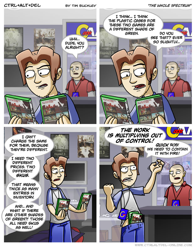 First Previous Random Next Last | 5 Share You are currently browsing the archive for Ctrl Alt Del First Previous Archive Random Next Last | 5 Share Tweet 24 The whole spectrum April 17, 2009 by Tim Subscribe Notify of new follow-up comments new replies to my comments Label {} [+] Name* Email* Δ Label {} [+] Name* Email* Δ 5 Comments Oldest Newest Most Voted Inline Feedbacks View all comments Arceus 7 years ago Theyre still the same game. Save yourself the trouble and just charge them as the same game Jimothy 5 years ago Reply to Arceus I’m sorry mate, are you new here? BlookyGhostDJ 4 years ago Reply to Jimothy Think he is. Maximum 3 years ago Reply to BlookyGhostDJ No he’s not, he’s been there since the beginning. Bogsalt 5 months ago He held it together as long as he could.