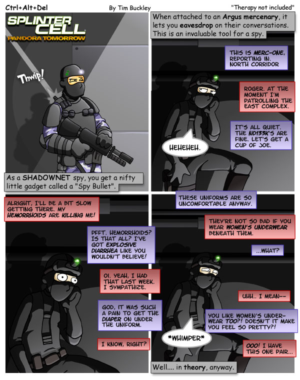 First Previous Random Next Last | 3 Share You are currently browsing the archive for Ctrl Alt Del First Previous Archive Random Next Last | 3 Share Tweet 24 Therapy not included March 22, 2004 by Tim Subscribe Notify of new follow-up comments new replies to my comments Label {} [+] Name* Email* Δ Label {} [+] Name* Email* Δ 3 Comments Oldest Newest Most Voted Inline Feedbacks View all comments MidnightDStroyer 7 years ago Even in the spy business, there IS such a thing as Too Much Information. Amanze Ihedioha 7 years ago Dorkly’s Metal Gear Box, anoyone? douglas 5 years ago that whimper was universal