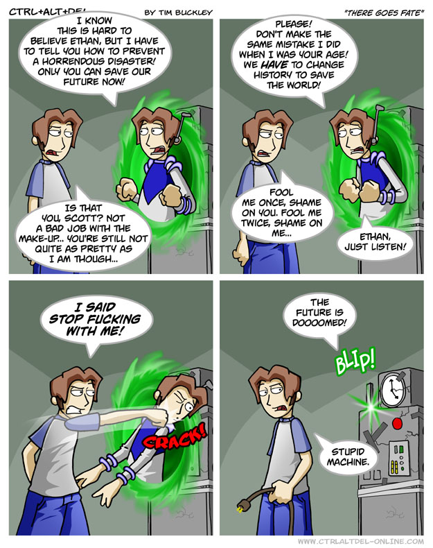 First Previous Random Next Last | 6 Share You are currently browsing the archive for Ctrl Alt Del First Previous Archive Random Next Last | 6 Share Tweet 24 There goes fate December 11, 2004 by Tim Subscribe Notify of new follow-up comments new replies to my comments Label {} [+] Name* Email* Δ Label {} [+] Name* Email* Δ 6 Comments Oldest Newest Most Voted Inline Feedbacks View all comments Rex 8 years ago he was trying to warn us of donald trump Yeet2 5 years ago Reply to Rex no, it was a warning of the robot invaision. Future Ethan shows up again in the last series of ver. 1 or whatever this ones called jonisnotameme 7 years ago rereading this series a second time, I realize that this event holds more significance than it may seem at first… douglas 5 years ago Reply to jonisnotameme for reAL Doctor Disaster 5 years ago Fool me once, shame on you. Fool me twice, shame on me. Fool me three times, I PUNCH YOUR FACE. Taylor 4 years ago Reply to Doctor Disaster Not sure if you’re trying to make a Regular Show reference but I just thought I’d mention that it’s kinda fun to read this comic with Rigby’s vouce for Ethan and Mordecai for Lucas since they match thier personalities a bit.