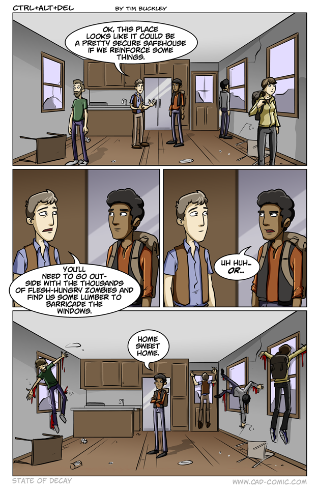 First Previous Random Next Last | 3 Share You are currently browsing the archive for Ctrl Alt Del First Previous Archive Random Next Last | 3 Share Tweet 24 There is an I in Zombie Apocalypse June 5, 2013 by Tim Subscribe Notify of new follow-up comments new replies to my comments Label {} [+] Name* Email* Δ Label {} [+] Name* Email* Δ 3 Comments Oldest Newest Most Voted Inline Feedbacks View all comments Pyrolich66 7 years ago “There’s no ‘I’ in team, Grif.” “Yeah, but there’s no ‘U’, either. So I guess if I’m not on the team, and you’re not on the team, nobody’s on the god-damn team! The team sucks!” -Red VS Blue Michael 6 years ago Food makes for a terrible barricade. Puretra 5 years ago Reply to Michael That’s what I was going to post