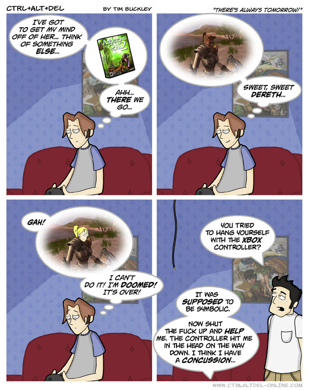First Previous Random Next Last | 4 Share You are currently browsing the archive for Ctrl Alt Del First Previous Archive Random Next Last | 4 Share Tweet 24 There’s always tomorrow November 20, 2002 by Tim Subscribe Notify of new follow-up comments new replies to my comments Label {} [+] Name* Email* Δ Label {} [+] Name* Email* Δ 4 Comments Oldest Newest Most Voted Inline Feedbacks View all comments BloodLehmus 3 years ago Can’t do that now, with all them wireless controllers and stuff! The Legacy 3 years ago Reply to BloodLehmus And the Xbox 360 had disconnects! *And this is what you call foreshadowing…* WastedDemon 2 years ago Reply to BloodLehmus Couldn’t even at the time, the original Xbox controller lead had a trip disconnect function which is what the joke is referencing. CasualOtaku 2 years ago If it was a Gen 1 controller that really had to hurt. Those things were NOT designed with girl gamers and/or small hands in mind.
