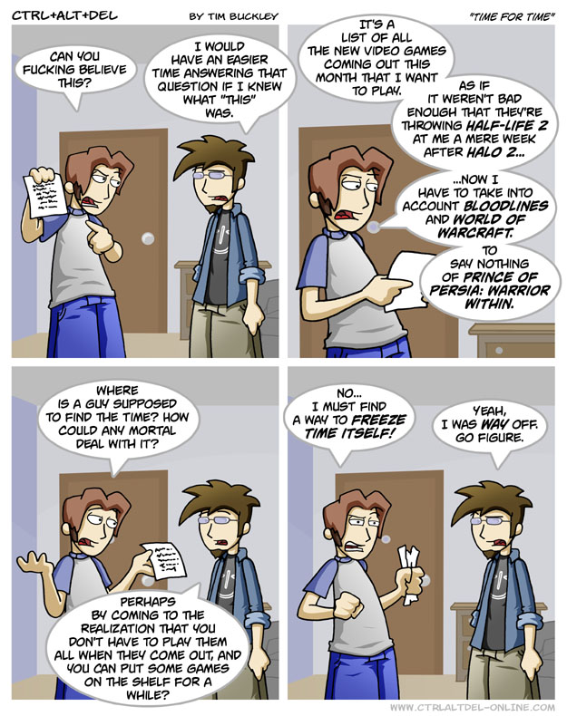 First Previous Random Next Last | 3 Share You are currently browsing the archive for Ctrl Alt Del First Previous Archive Random Next Last | 3 Share Tweet 24 Time for time November 15, 2004 by Tim Subscribe Notify of new follow-up comments new replies to my comments Label {} [+] Name* Email* Δ Label {} [+] Name* Email* Δ 3 Comments Oldest Newest Most Voted Inline Feedbacks View all comments MidnightDStroyer 7 years ago But…But…How long is it going to take to *build* the time machine? How far are you going to get behind on your games before you can even *start* playing again? Arceus 7 years ago Reply to MidnightDStroyer How is he going to play the games at all if time is frozen? Aeglor 7 years ago If only we knew back then…