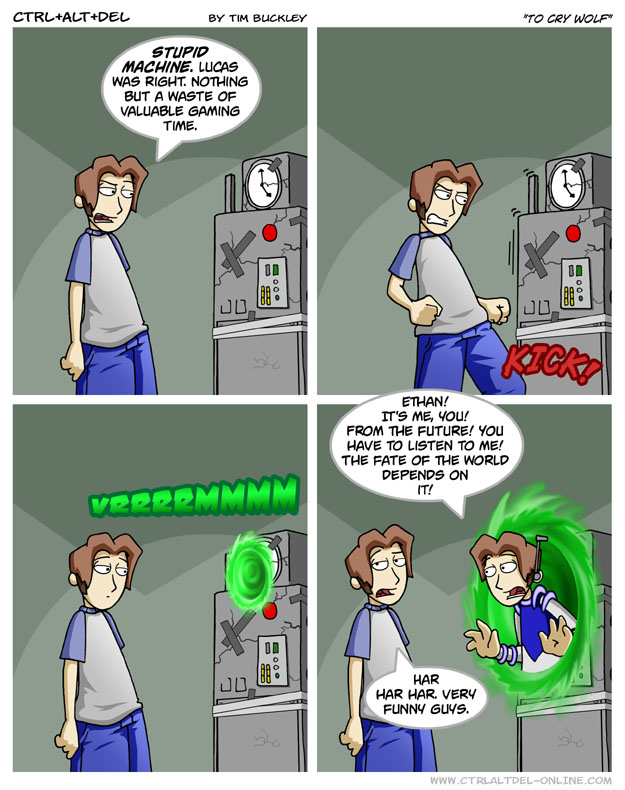 First Previous Random Next Last | 2 Share You are currently browsing the archive for Ctrl Alt Del First Previous Archive Random Next Last | 2 Share Tweet 24 To cry wolf December 10, 2004 by Tim Subscribe Notify of new follow-up comments new replies to my comments Label {} [+] Name* Email* Δ Label {} [+] Name* Email* Δ 2 Comments Oldest Newest Most Voted Inline Feedbacks View all comments Random guy 7 years ago It’s him. Kill the machine, destroy it. Before it’s too late. Before it ruins this. Tahiri 3 years ago Reply to Random guy No you fool! You couldn’t have known commenting when you did but the world was about to go to hell in a hand basket. SAVE US FUTURE ETHAN!