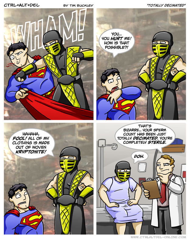 First Previous Random Next Last | 6 Share You are currently browsing the archive for Ctrl Alt Del First Previous Archive Random Next Last | 6 Share Tweet 24 Totally decimated July 7, 2008 by Tim Subscribe Notify of new follow-up comments new replies to my comments Label {} [+] Name* Email* Δ Label {} [+] Name* Email* Δ 6 Comments Oldest Newest Most Voted Inline Feedbacks View all comments Shawn 5 years ago “And while I’ve got you here, how the hell are you even alive with a flaming skull for a head???” Dingle Bloopynoop 3 years ago Reply to Shawn that’s the neat part: he’s not Sad Robot 3 years ago Doc, decimate means to take to the tenth, the word that describes what your trying to say is obliterated. Seriously when is this plague of malapropisms going to end? Stacts 2 years ago Reply to Sad Robot Probably when “Awful” goes back to meaning: Full of Awe. Dekker451 3 months ago Reply to Sad Robot https://www.merriam-webster.com/dictionary/decimate Definition 3a: “to reduce drastically especially in number” Context matters. Taylor 3 years ago Mortal Kombat vs DC could’ve been so much cooler. Why would you ever make a T rated MK game?