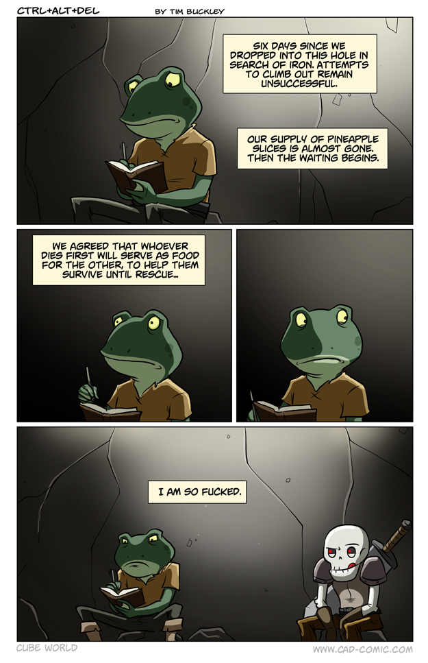 First Previous Random Next Last | 4 Share You are currently browsing the archive for Ctrl Alt Del First Previous Archive Random Next Last | 4 Share Tweet 24 Traveling companion July 10, 2013 by Tim Subscribe Notify of new follow-up comments new replies to my comments Label {} [+] Name* Email* Δ Label {} [+] Name* Email* Δ 4 Comments Oldest Newest Most Voted Inline Feedbacks View all comments Pyrolich66 7 years ago Does the skeleton even need food? MidnightDStroyer 7 years ago Reply to Pyrolich66 Would a skeleton be able to digest food? You know, no stomach, no intestines, etc. I’d bet he couldn’t even hold his liquor. Griever 7 years ago Reply to MidnightDStroyer Skeletons don’t need nourishment. They just enjoy the texture of chewing live meat. Him. 7 years ago Reply to Pyrolich66 Hey, food is nice to eat. Tastes like chicken.