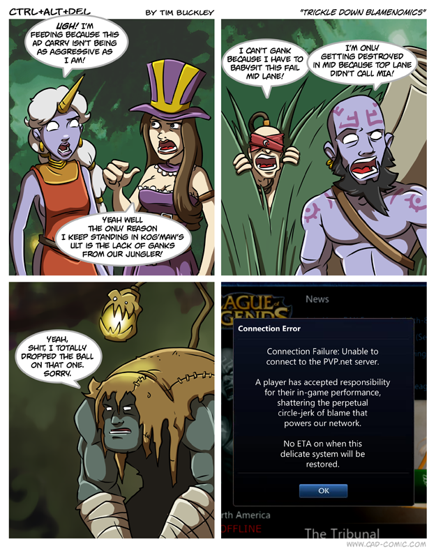 First Previous Random Next Last | 2 Share You are currently browsing the archive for Ctrl Alt Del First Previous Archive Random Next Last | 2 Share Tweet 24 Trickle down blamenomics March 28, 2012 by Tim Subscribe Notify of new follow-up comments new replies to my comments Label {} [+] Name* Email* Δ Label {} [+] Name* Email* Δ 2 Comments Oldest Newest Most Voted Inline Feedbacks View all comments Hamstermer 8 years ago And I was JUST about to beat those losers when this stupid server wen- hey it’s working. Nice! I feel bad for complaining… Oh no it stopped again! Carbo 3 years ago Don’t worry they have this cool backup system, slurs and death threats!