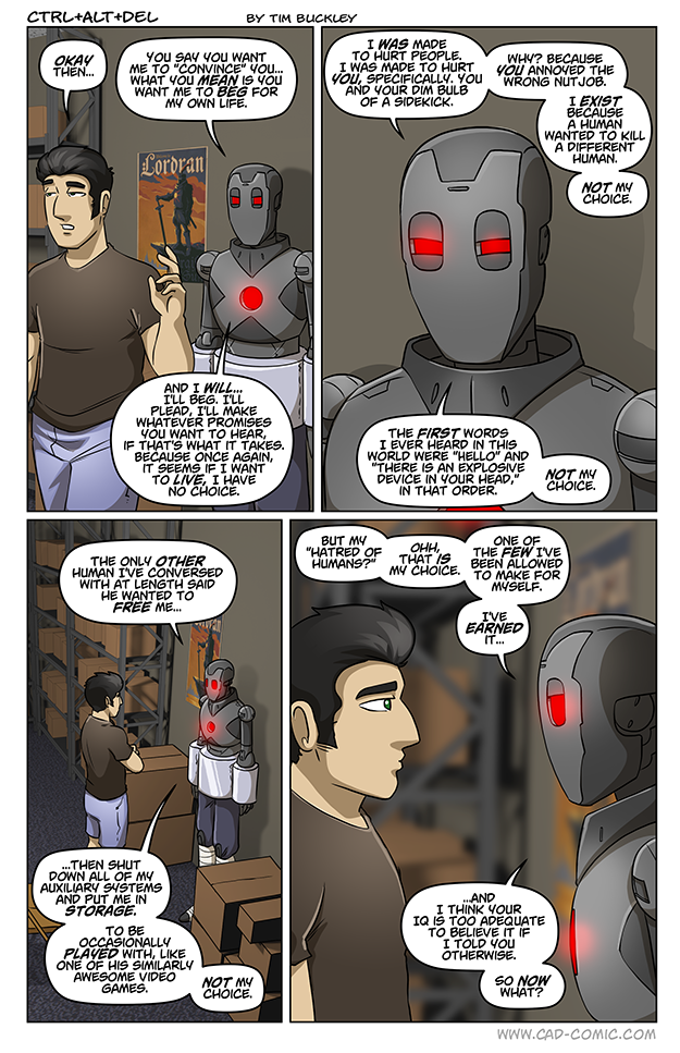 In yesterday’s page, Lucas acknowledged responsibility for any future harm caused by the killbot. I agree that it’s odd how the machine knows it could lie and manipulate its way to freedom but “chooses” instead to dig it’s own grave. I wonder if that’s actually the robot’s choice or if it’s a kind of weird safety measure built in by the Master. The line of thought being, “Ok, worst case scenario, my enemies capture this amazing robot. I don’t want it used against me so I’m going to program an unstoppable monologue of human-hating so my enemies will never trust… Read more »