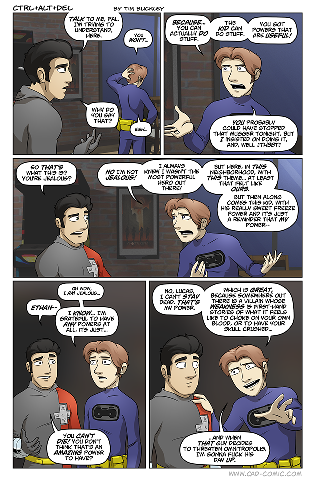 Think I’ve figured out Ethan’s real hang-up with Game Boy: he knows what it’s like to die in just about every horrible way imaginable, and he knows herowork is dangerous. I think part of why he’s upset is because he doesn’t want the kid to go through something he knows in excruciating detail. Also, everyone’s making comments about Ethan’s sanity or what would happen if a mind-reading villain got a hold of him, and that makes me think. In the origin comic, Ethan seemed silly, but…normal. Lucas probably thinks Ethan got weirder because his power made him reckless, but what… Read more »
