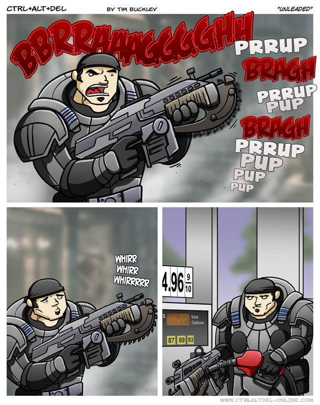 First Previous Random Next Last | 5 Share You are currently browsing the archive for Ctrl Alt Del First Previous Archive Random Next Last | 5 Share Tweet 24 Unleaded November 10, 2008 by Tim Subscribe Notify of new follow-up comments new replies to my comments Label {} [+] Name* Email* Δ Label {} [+] Name* Email* Δ 5 Comments Oldest Newest Most Voted Inline Feedbacks View all comments Hiatus 8 years ago the expression in the last panel: Priceless! Rocketeer 7 years ago THis does actually bring up the question: how are those things powered? Him. 7 years ago Reply to Rocketeer Antimatter-catalyzed nuclear pulses! Intrepyd45 4 years ago Oh those immediately post-Obama win gas prices… I do not miss them They lasted way too long Matt 3 years ago And suddenly this comic is relevant again 🙁