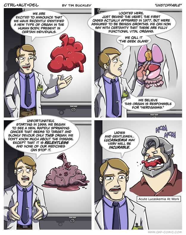 First Previous Random Next Last | 3 Share You are currently browsing the archive for Ctrl Alt Del First Previous Archive Random Next Last | 3 Share Tweet 24 Unstoppable April 4, 2012 by Tim Subscribe Notify of new follow-up comments new replies to my comments Label {} [+] Name* Email* Δ Label {} [+] Name* Email* Δ 3 Comments Oldest Newest Most Voted Inline Feedbacks View all comments MidnightDStroyer 7 years ago Yeah, George shouldn’t have sold out to Disney. That’s when the cell structure of the organ began mutating into a cancerous strain. TheNinjamime 7 years ago Reply to MidnightDStroyer Nah that was when he decided to edit his original films of Star Wars without creating a copy or backup so he could force his creative vision on us. It just took a while to notice the impact Lad 23 days ago Reply to TheNinjamime While I’m not a fan of the post-release editing thing… why is it an issue if the creator wants to make sure that their vision is shared..?