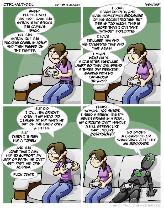 For a machine that needs no food, rest or sleep, that’s really saying something about how mad she is. Might as well move Ethan’s blanket & pillow outside into the doghouse for the next century or two. Just put him on a leash to take him to Lillah’s tournaments & have Lucas haul him away once he’s pissed Lillah off.