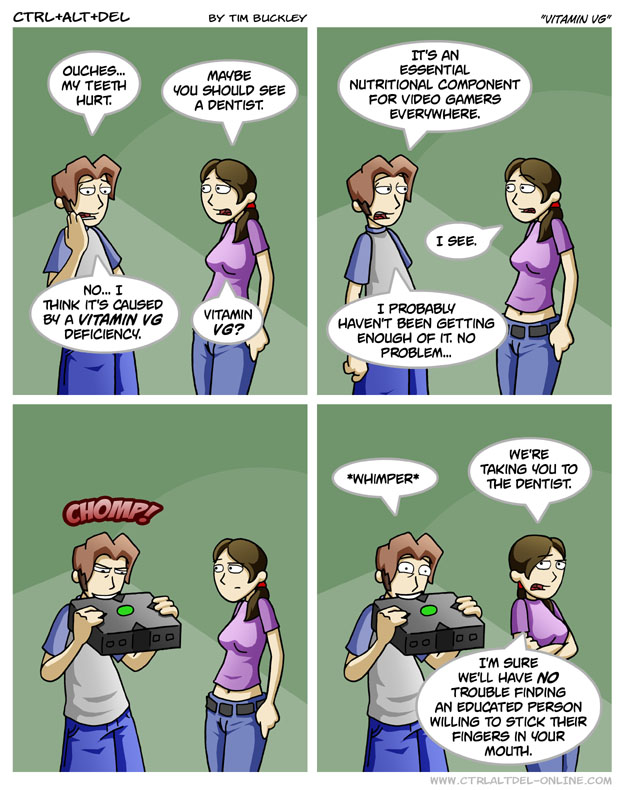 First Previous Random Next Last | 5 Share You are currently browsing the archive for Ctrl Alt Del First Previous Archive Random Next Last | 5 Share Tweet 24 Vitamin VG July 23, 2004 by Tim Subscribe Notify of new follow-up comments new replies to my comments Label {} [+] Name* Email* Δ Label {} [+] Name* Email* Δ 5 Comments Oldest Newest Most Voted Inline Feedbacks View all comments Hamstermer 7 years ago Honestly Ethan probably has one of the highest concentrations of Vitamin VG in the world MidnightDStroyer 7 years ago Reply to Hamstermer But is it even possible to have too much Vitamin VG? Nay, I say unto thee, NAY! Random guy 7 years ago Reply to MidnightDStroyer It is not possible to have too much Vitamin VG. But it’s possible to have too much Vitamin S(fors tupidity) Arceus 7 years ago As Bender would say: “Bite my shiny metal ass” Talis 3 years ago Reply to Arceus Here, it’s: “Bite my shiny metal case” 🙂