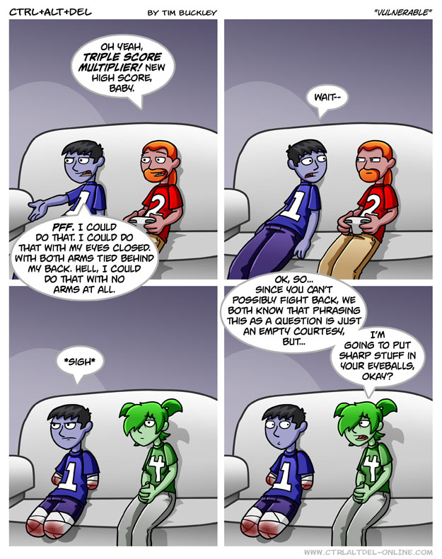 First Previous Random Next Last | 2 Share You are currently browsing the archive for Ctrl Alt Del First Previous Archive Random Next Last | 2 Share Tweet 24 Vulnerable July 23, 2007 by Tim Subscribe Notify of new follow-up comments new replies to my comments Label {} [+] Name* Email* Δ Label {} [+] Name* Email* Δ 2 Comments Oldest Newest Most Voted Inline Feedbacks View all comments MidnightDStroyer 7 years ago That would keep him from watching, certainly. But if you don’t want him negatively commenting on your skillz, you’ll have to either cut his tongue out or slit his throat…Or both, your choice. Verycool 1 year ago His face is like “gaw shit”