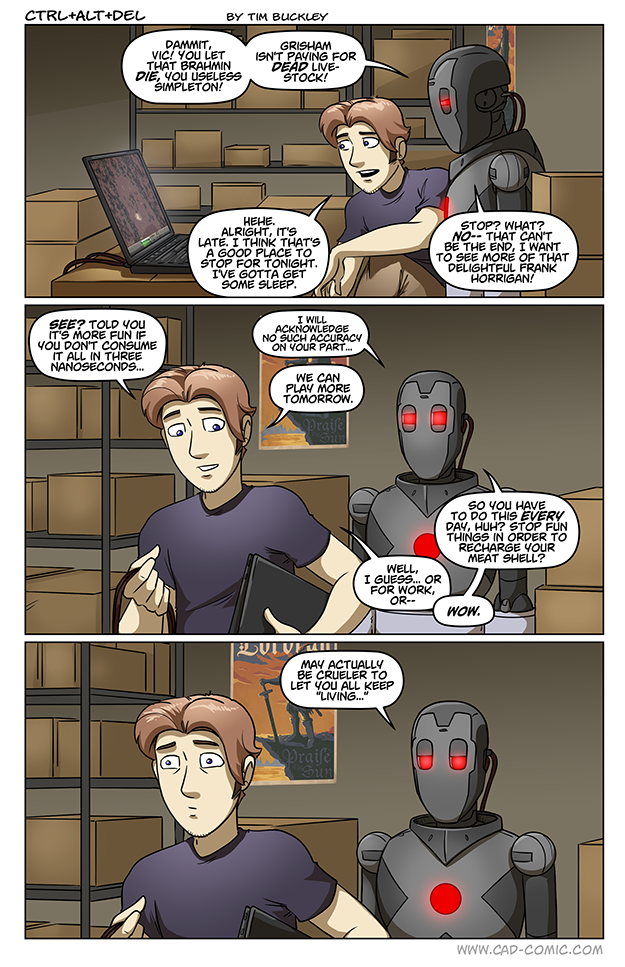 Get ready for a minute analysis/nitpicking. Hold on, let me put my nerdy glasses on… Let’s talk about cables. Specifically, the 2 that are hooked up to Zeke’s neck and the 2 that are hooked up to Ethan’s laptop. They seem to share the same color and design across multiple pages, so it’s reasonable to assume that those are the same cables connecting Zeke and the laptop (breathtaking deduction, I know, but bear with me for the moment). This correlates with what Ethan said on panel 1 of this page (https://cad-comic.com/comic/connect/): Zeke doesn’t require keyboard and mouse to play, so… Read more »