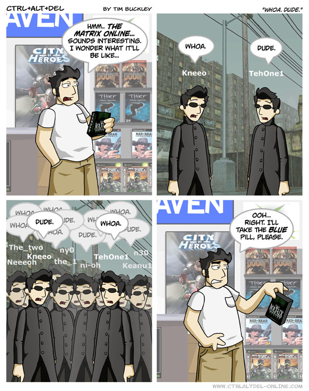 First Previous Random Next Last | 2 Share You are currently browsing the archive for Ctrl Alt Del First Previous Archive Random Next Last | 2 Share Tweet 24 Whoa. Dude. May 21, 2004 by Tim Subscribe Notify of new follow-up comments new replies to my comments Label {} [+] Name* Email* Δ Label {} [+] Name* Email* Δ 2 Comments Oldest Newest Most Voted Inline Feedbacks View all comments Hamstermer 8 years ago Dude. Whoa. Sebastian 4 years ago This reminds me of a SNL sketch, Celebrity Jeopardy, and they were supposed to bring Keanu Reeves and he was like “I know kung fu” “For the last time, no, you don’t”