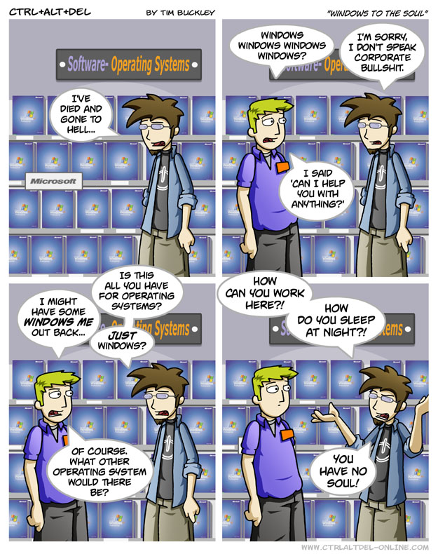 First Previous Random Next Last | 3 Share You are currently browsing the archive for Ctrl Alt Del First Previous Archive Random Next Last | 3 Share Tweet 24 Windows to the soul July 14, 2004 by Tim Subscribe Notify of new follow-up comments new replies to my comments Label {} [+] Name* Email* Δ Label {} [+] Name* Email* Δ 3 Comments Oldest Newest Most Voted Inline Feedbacks View all comments Hamstermer 8 years ago He also doesn’t have a Heart, but that’s a different issue Dingleshits McDanglybits 4 years ago Why would a computer store sell a free and open source OS anyway? Robert 'CockRoach' Archer 1 year ago Reply to Dingleshits McDanglybits funny enough back in late 90s and early 2ks there WERE some linux distro companies that sold at places like walmart, best buy, and such as the Lindows, Mandrake, and suse linux