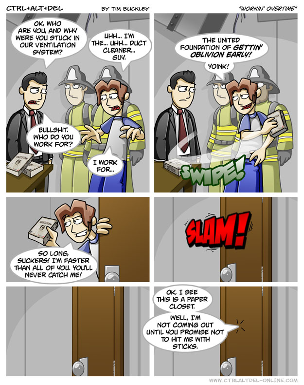 First Previous Random Next Last | 3 Share You are currently browsing the archive for Ctrl Alt Del First Previous Archive Random Next Last | 3 Share Tweet 24 Workin’ overtime March 17, 2006 by Tim Subscribe Notify of new follow-up comments new replies to my comments Label {} [+] Name* Email* Δ Label {} [+] Name* Email* Δ 3 Comments Oldest Newest Most Voted Inline Feedbacks View all comments The King of JUSTICE 6 years ago the firedude in the back is so done with this shit Doctor Disaster 5 years ago Reply to The King of JUSTICE Both of them are staring at the air ducts. Their minds are on the same wavelength of “How in the world did this man fit in there?”. Jamie 3 years ago Reply to The King of JUSTICE Even in other cities I have to think most firefighters are on a first name basis with Ethan