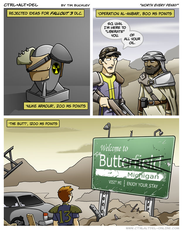 First Previous Random Next Last | 3 Share You are currently browsing the archive for Ctrl Alt Del First Previous Archive Random Next Last | 3 Share Tweet 24 Worth every penny May 20, 2009 by Tim Subscribe Notify of new follow-up comments new replies to my comments Label {} [+] Name* Email* Δ Label {} [+] Name* Email* Δ 3 Comments Oldest Newest Most Voted Inline Feedbacks View all comments Arceus 7 years ago At least they kept the Beta Tesla Cannon in the game. Him. 7 years ago The Butt was actually rejected because the people responsible for it kind of gave up and so its a signpost and about 2 minutes worth of empty landscape. Kazzie 2 years ago Reply to Him. You mean they couldn’t be arsed?