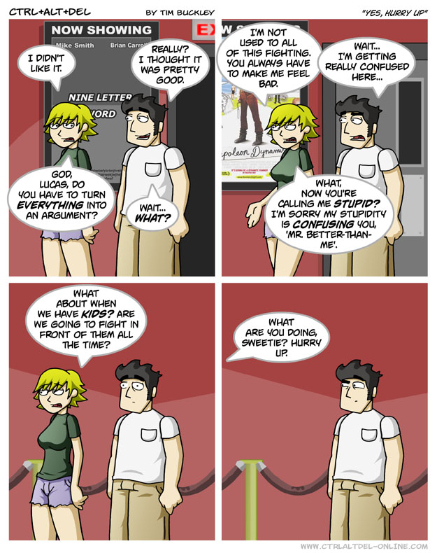 First Previous Random Next Last | 6 Share You are currently browsing the archive for Ctrl Alt Del First Previous Archive Random Next Last | 6 Share Tweet 24 Yes, hurry up September 4, 2004 by Tim Subscribe Notify of new follow-up comments new replies to my comments Label {} [+] Name* Email* Δ Label {} [+] Name* Email* Δ 6 Comments Oldest Newest Most Voted Inline Feedbacks View all comments Arceus 7 years ago Sounds like someone is a bit bipolar. israel saucedo 5 years ago Reply to Arceus Wait this isn’t a normal relationship?(….. might explain why my relationships always go bad) jpic89 5 years ago Reply to Arceus Not at all what bipolar is like, but sure, keep misrepresenting a very serious and debilitating mental illness. Cobalion 4 years ago Reply to jpic89 will do Dingleshits McDanglybits 4 years ago I dated someone like this too. DarkFox 4 years ago This is called gaslighting, and that is a major red flag. She’s abusive. GTFO now.