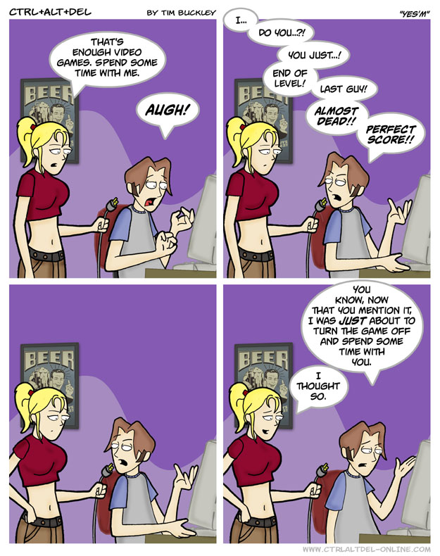 First Previous Random Next Last | 7 Share You are currently browsing the archive for Ctrl Alt Del First Previous Archive Random Next Last | 7 Share Tweet 24 Yes’m November 12, 2002 by Tim Subscribe Notify of new follow-up comments new replies to my comments Label {} [+] Name* Email* Δ Label {} [+] Name* Email* Δ 7 Comments Oldest Newest Most Voted Inline Feedbacks View all comments Kitsune 8 years ago The real question being how the hell did ethan attract her to start with? Arceus837 7 years ago Reply to Kitsune I think that mystery shall forever remain unsolved. Aeglor 7 years ago Reply to Arceus837 Boobs. Poe-Etic 5 years ago Reply to Kitsune Must have been the tongue piercing. Corena 7 years ago No, that’s how She attracted him. Brendan 3 years ago You know, this is such an interesting snapshot of the past. It used to be kind of assumed that Sara was in the right- now I look at that and go “Holy shit that’s abusive.” The Legacy 3 years ago Reply to Brendan Totally. ?