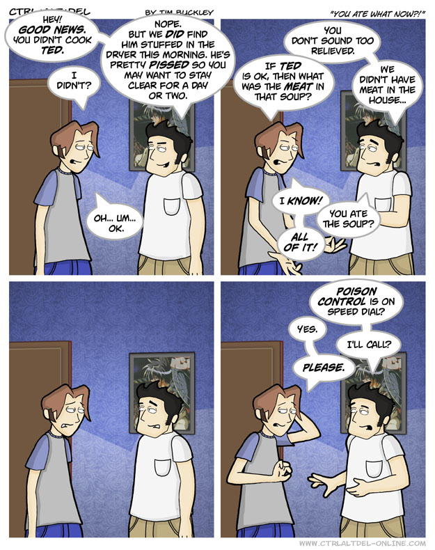 First Previous Random Next Last | 2 Share You are currently browsing the archive for Ctrl Alt Del First Previous Archive Random Next Last | 2 Share Tweet 24 You ate what now?! December 18, 2002 by Tim Subscribe Notify of new follow-up comments new replies to my comments Label {} [+] Name* Email* Δ Label {} [+] Name* Email* Δ 2 Comments Oldest Newest Most Voted Inline Feedbacks View all comments RMagepedia 8 years ago Hm… Knowning Ethan? Rat tail soup. Explains his first interactions with Lilah… :l Jimmy 3 years ago I long for Ethan’s lack of consideration of consequences. Goddamnit I crave it. What a way to live. What a way to be alive…