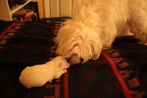 Yesterday we were called in for our first assignment. This is Khloe, and her two-week-old puppy Korra.