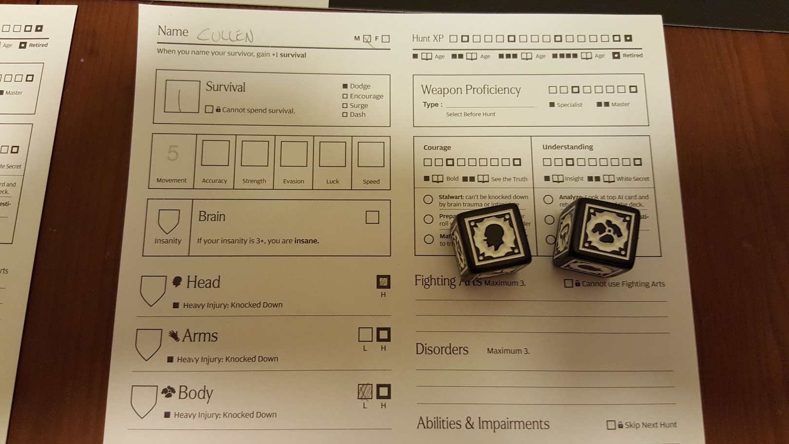 I nominate Gaius and Saoirse to roll on the intimacy table, hoping to add new life to my colony, but the die comes up with a three! Saoirse and her child die in childbirth. Gaius is so distraught he gains +3 Insanity (insanity is like Armor for the brain location), and develops the Prey disorder, under which believes he is destined to die, and unable to spend survival unless he is officially insane (Insanity at 3 or higher).