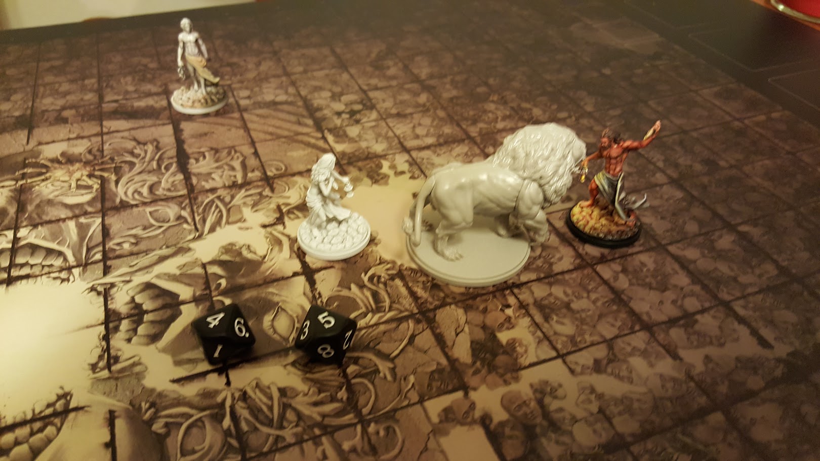 With a snarl, Ayana lashes out with her stone, rolling a Lantern Ten (perfect/automatic hit) on the Lion’s Tail. She wounds it… but the beast is startled! It charges forward, grabbing poor Saoirse in its mighty jaws and dragging her off into the corner of the board! She suffers damage to her chest in the process and is knocked down.