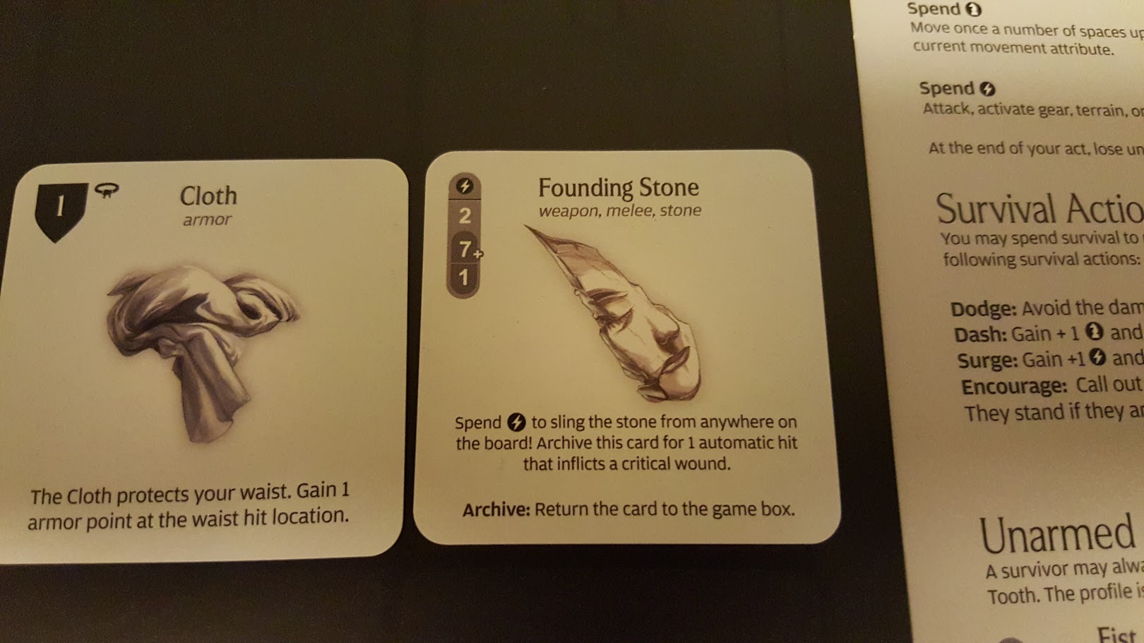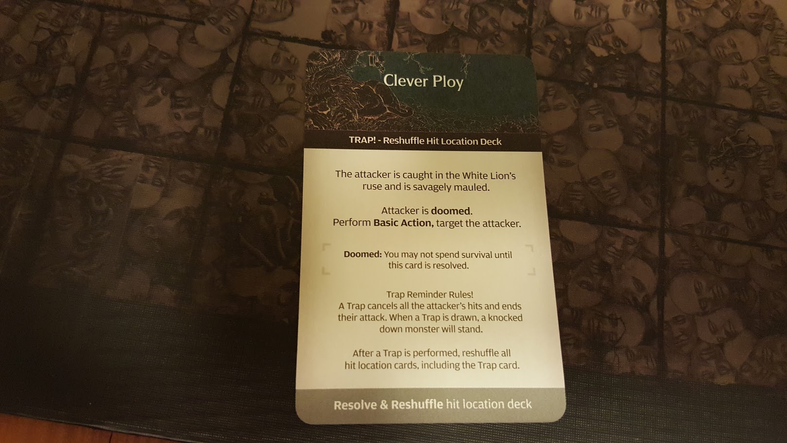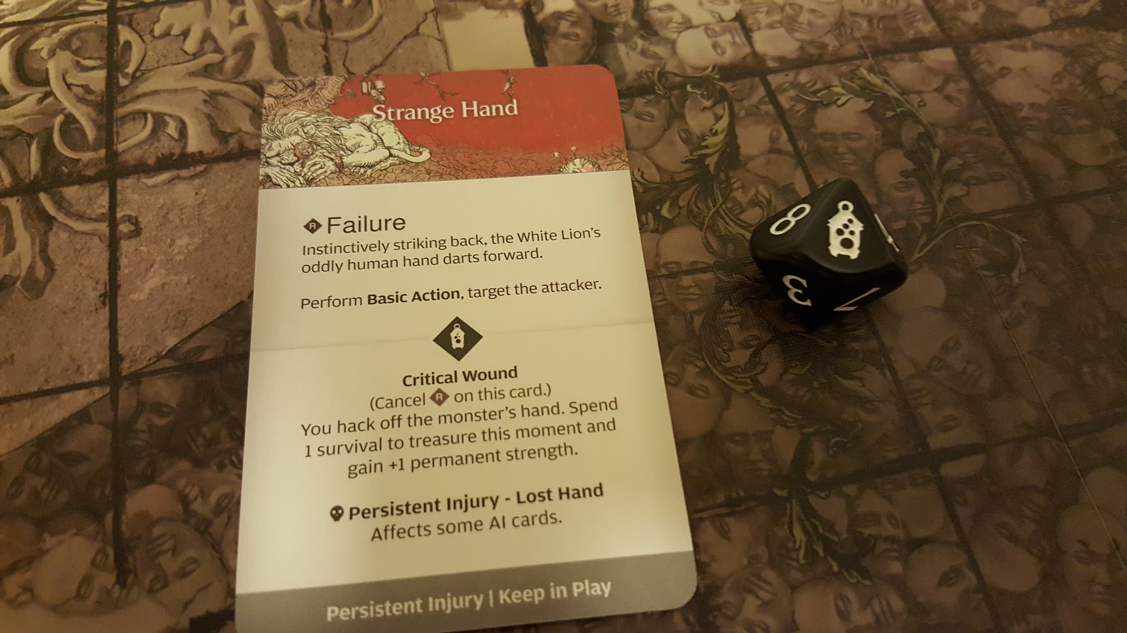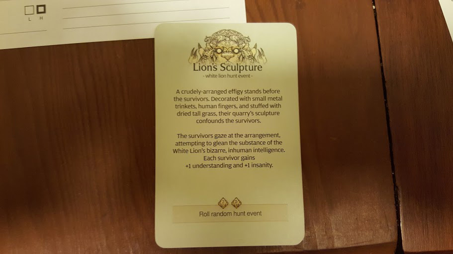 By critically wounding the Lion’s hand, Cullen not only avoided the Reaction (the Lion would have turned around and attacked me if I had failed to wound), but he severed the creature’s paw! I had Cullen spend his lone survival point to treasure the moment, gaining him +1 strength permanently. (It didn’t come into play this time, but the Lion is now unable to make certain attacks using that hand. Some of the AI cards would be negated.)