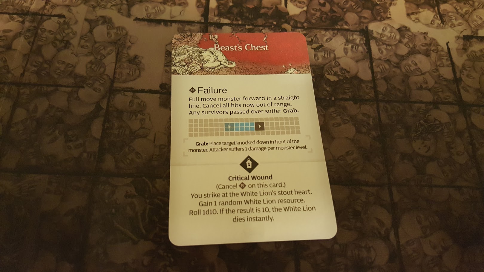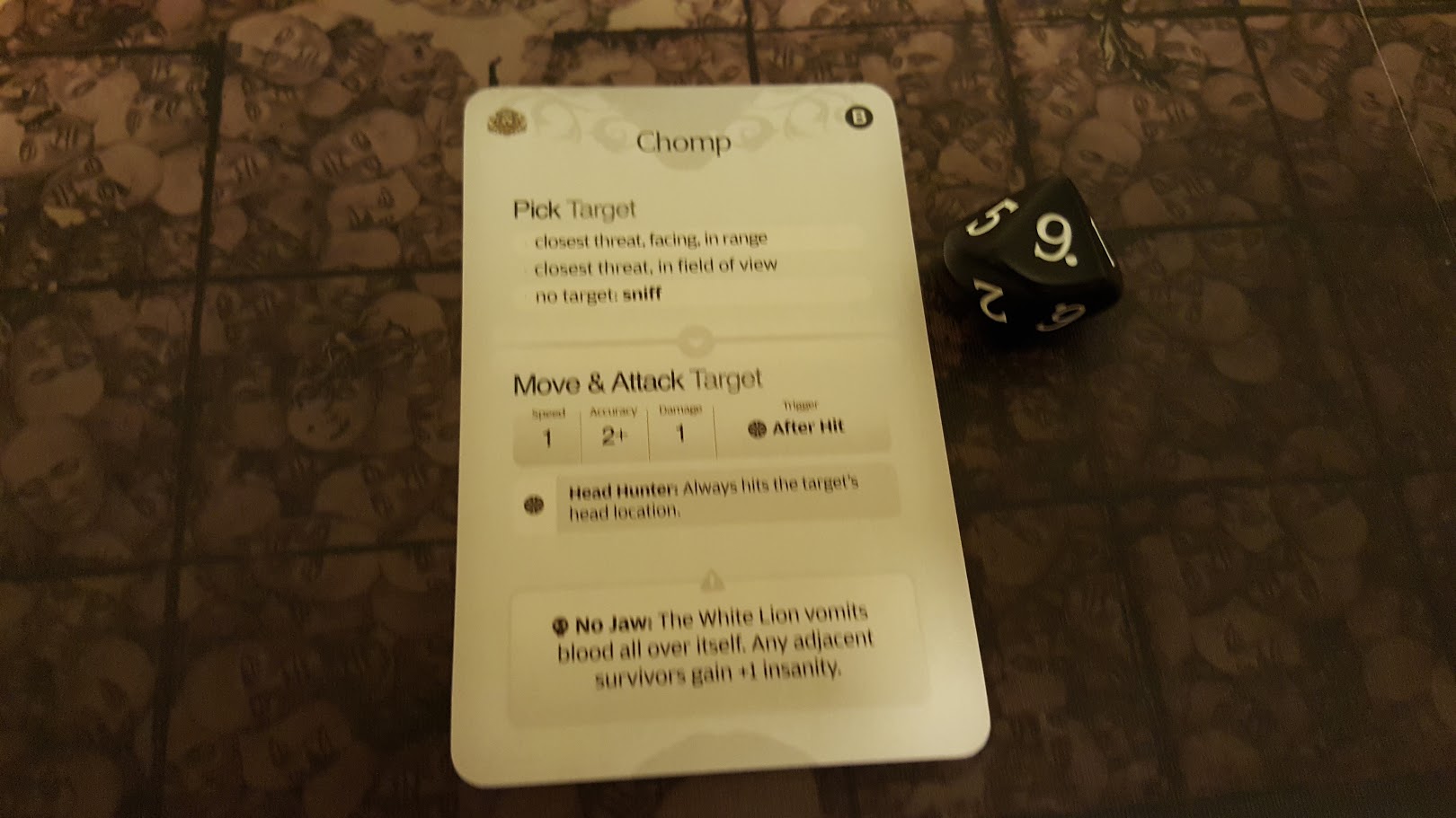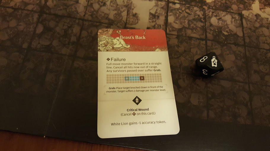 A normal basic action for the Lion is 2 speed, meaning 2 attacks. If one of my survivors stepped foot into the “Zone of Death” (ie, melee range), they’d now be taking 4 attacks, each only needing to roll a 2+ to hit, and each dealing 2 damage points per location rolled! That had the chance to outright kill any of my survivors, so I knew I had to get rid of it immediately. The card specifies that when the Lion is wounded, Ground Fighting is discarded.