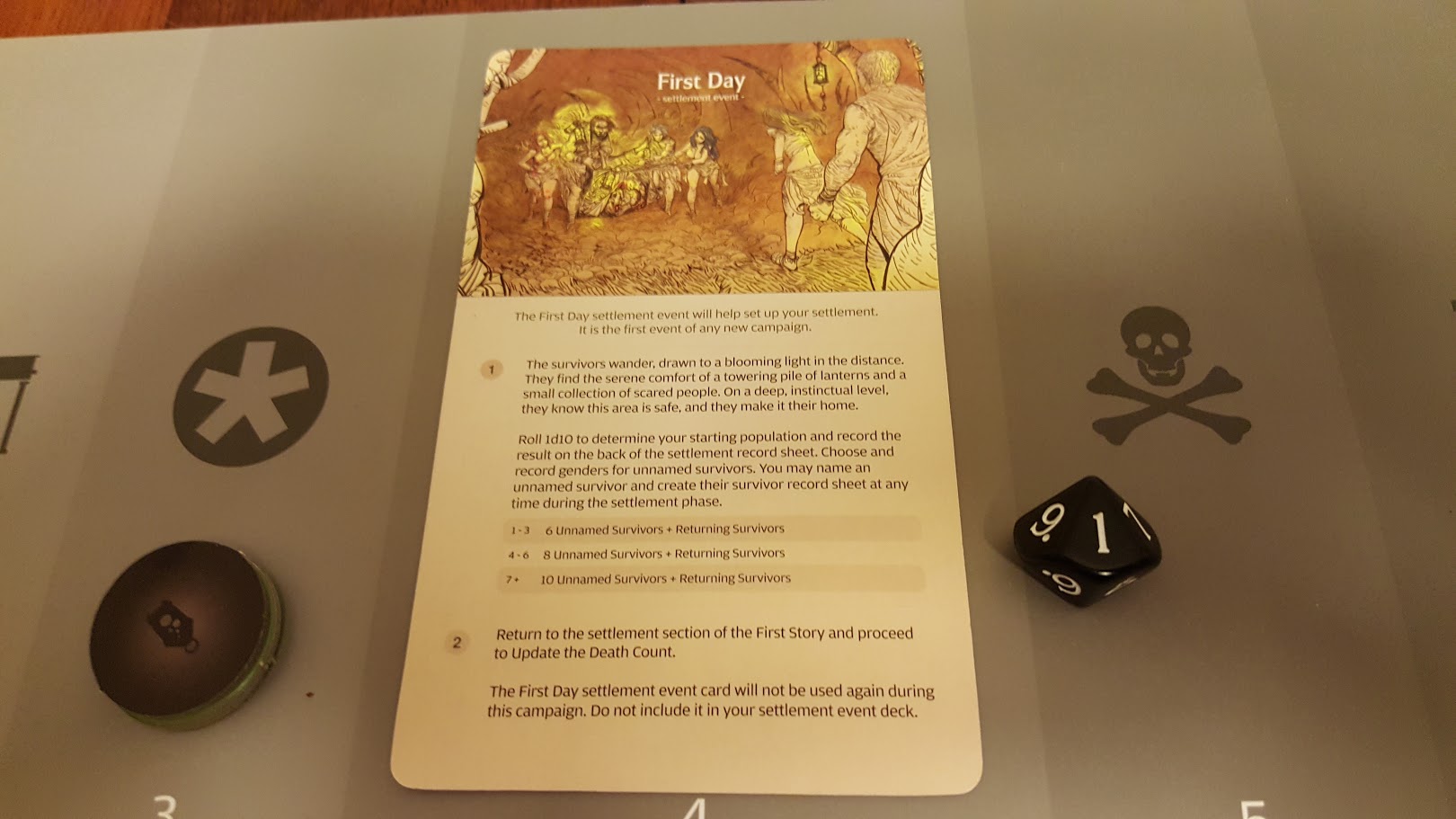 Having survived the immediate threat, and exhausted from their trial, my small band of humans wander to the lone beacon on the horizon; a pile of glowing lanterns. There, they encounter other survivors. I name my small settlement Arcadia, and roll to find out how many people have been drawn to our new home, coming up with a measly 1 on the die. Six new nameless survivors are added to my settlement.