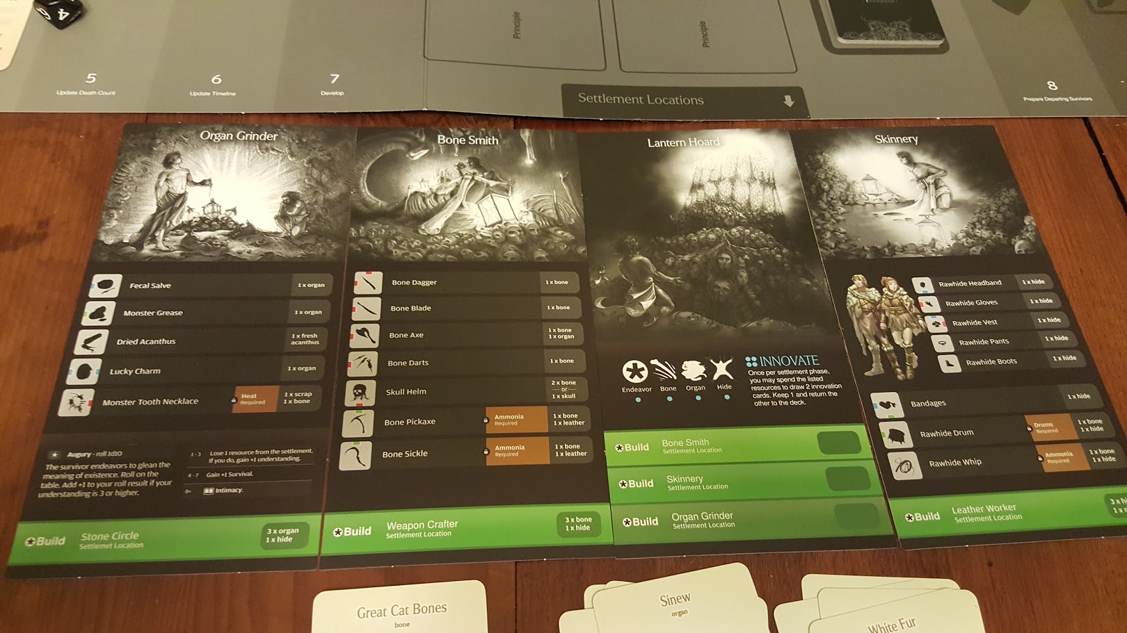 With the four Endeavor I gained from having four survivors return from the hunt, I choose to build the Organ Grinder, Bone Smith and Skinnery settlement locations.