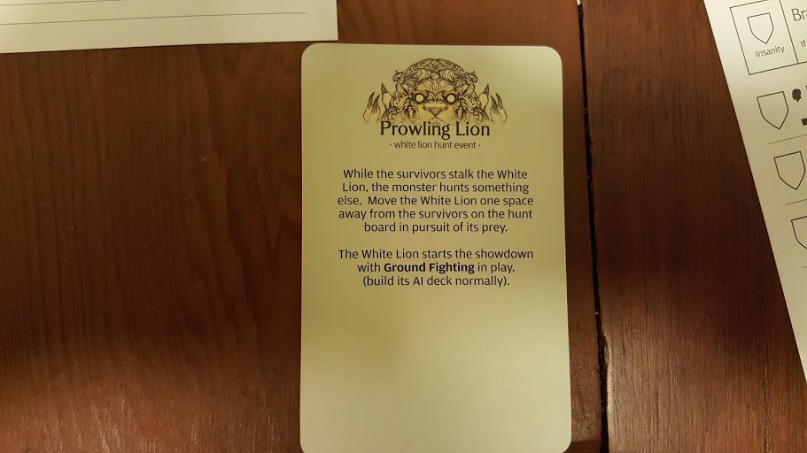 As we hunt him, the Lion is hunting something else, and moves one space further away from us. He will also start the fight with the Ground Fighting ability, a nasty little manuever in which the Lion lies down and waits for a survivor to draw near. When one does, it unleashes a devastating attack.