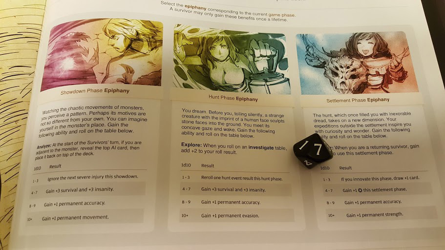 Fortunately, all of my survivors’ insanity is relatively low (Gaius’ being the highest at 4), and all of them manage to roll above their insanity, gaining understanding. Johan now has 3 understanding, which triggers the Insight event.