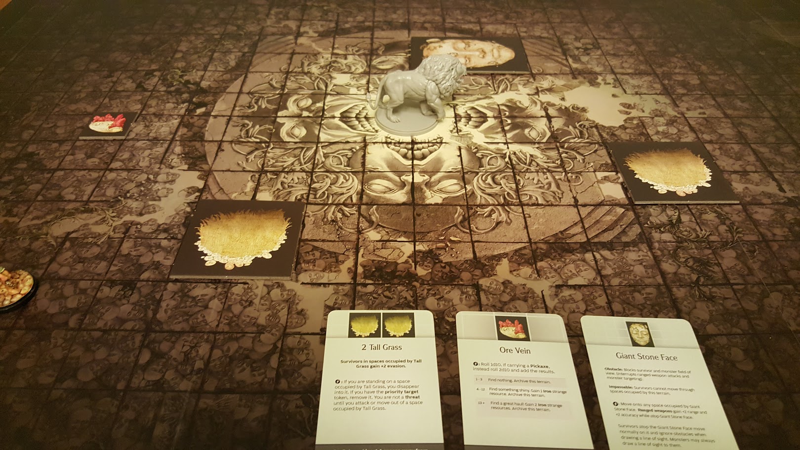 I put the Lion in the center, surrounded by the assigned terrain spaced out for my survivors to use as cover. Due to the Hunt Track event, the Lion was starting with this awful little ability: