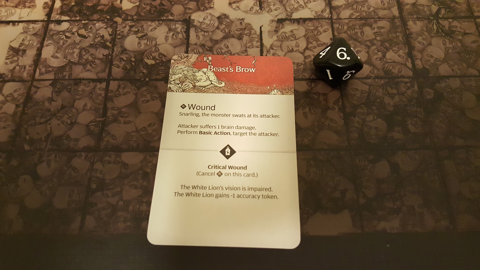 Cullen (who should have been knocked down, unable to act, but oh well), also moves around behind the Lion, making his two attacks and connecting with one of them! I draw a card from the Lion hit location deck to see where Cullen has landed his attack… it’s the creature’s Strange Hand! I roll a die attempting to wound the location (the strength of my character and/or weapon + the die roll vs the monster’s toughness [6]) and roll a Lantern 10! A critical wound!