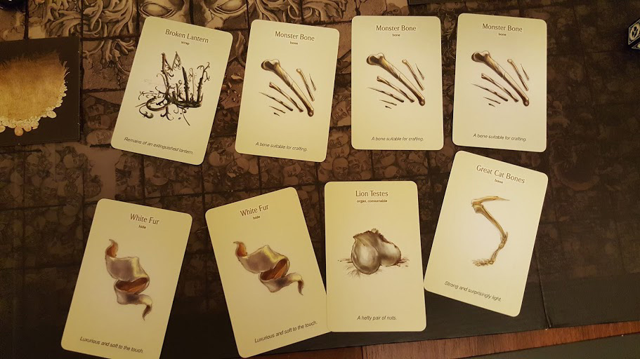 The Hunt Track is set up according the prey and level I’ve chosen. The hunting party will advance towards their prey, encountering random events in the darkness along the way. They step forward, and I flip over the first card.